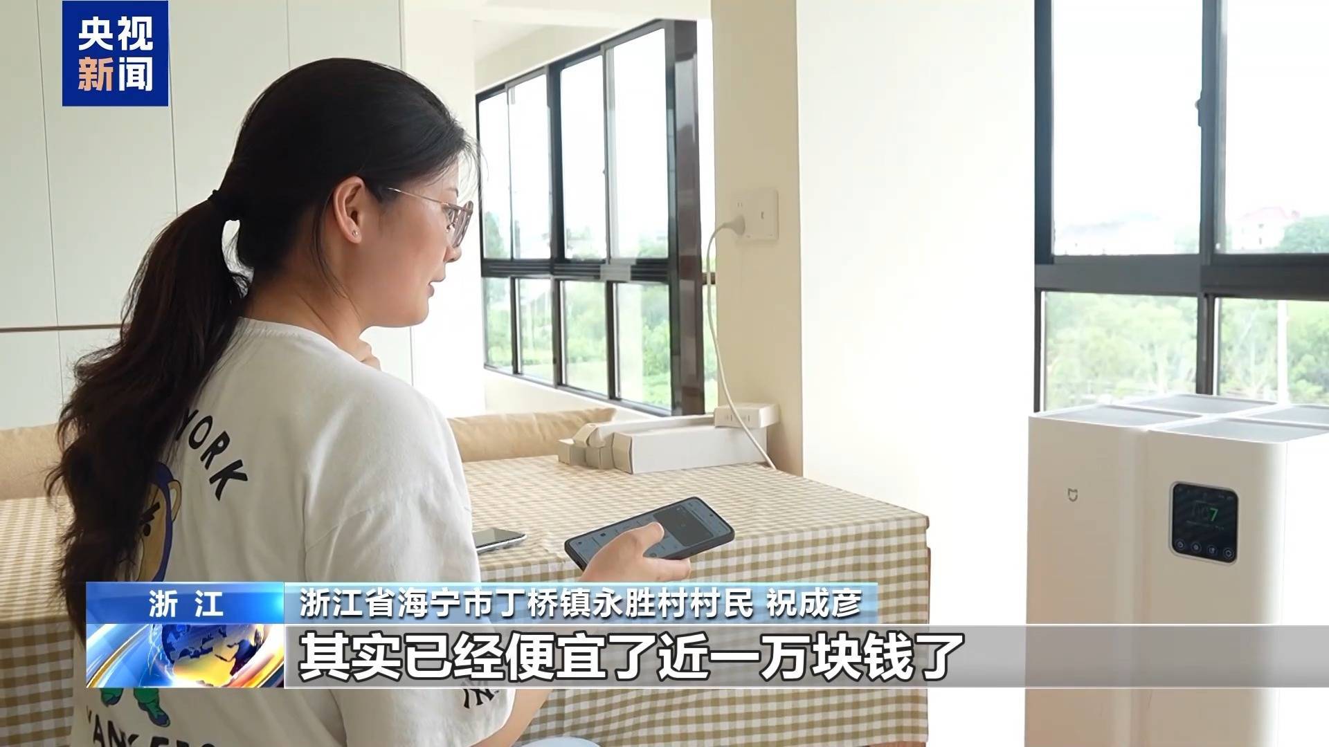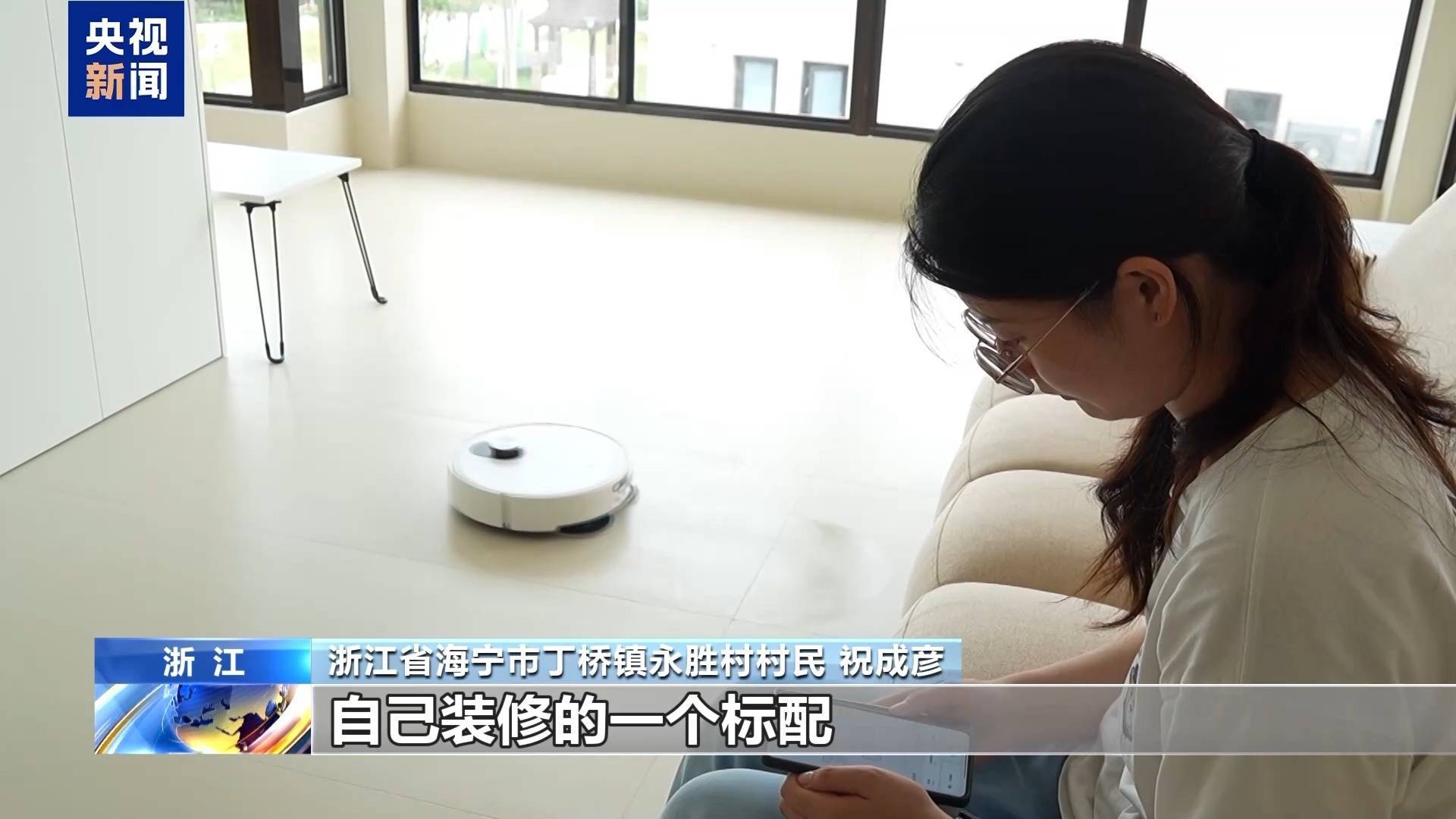 浙江省海宁市丁桥镇永胜村村民 祝成彦:扫地机器人有活动,加上国补便宜了八百多,零零散散的像灯具、洗衣机加起来已经便宜了近一万块钱了。