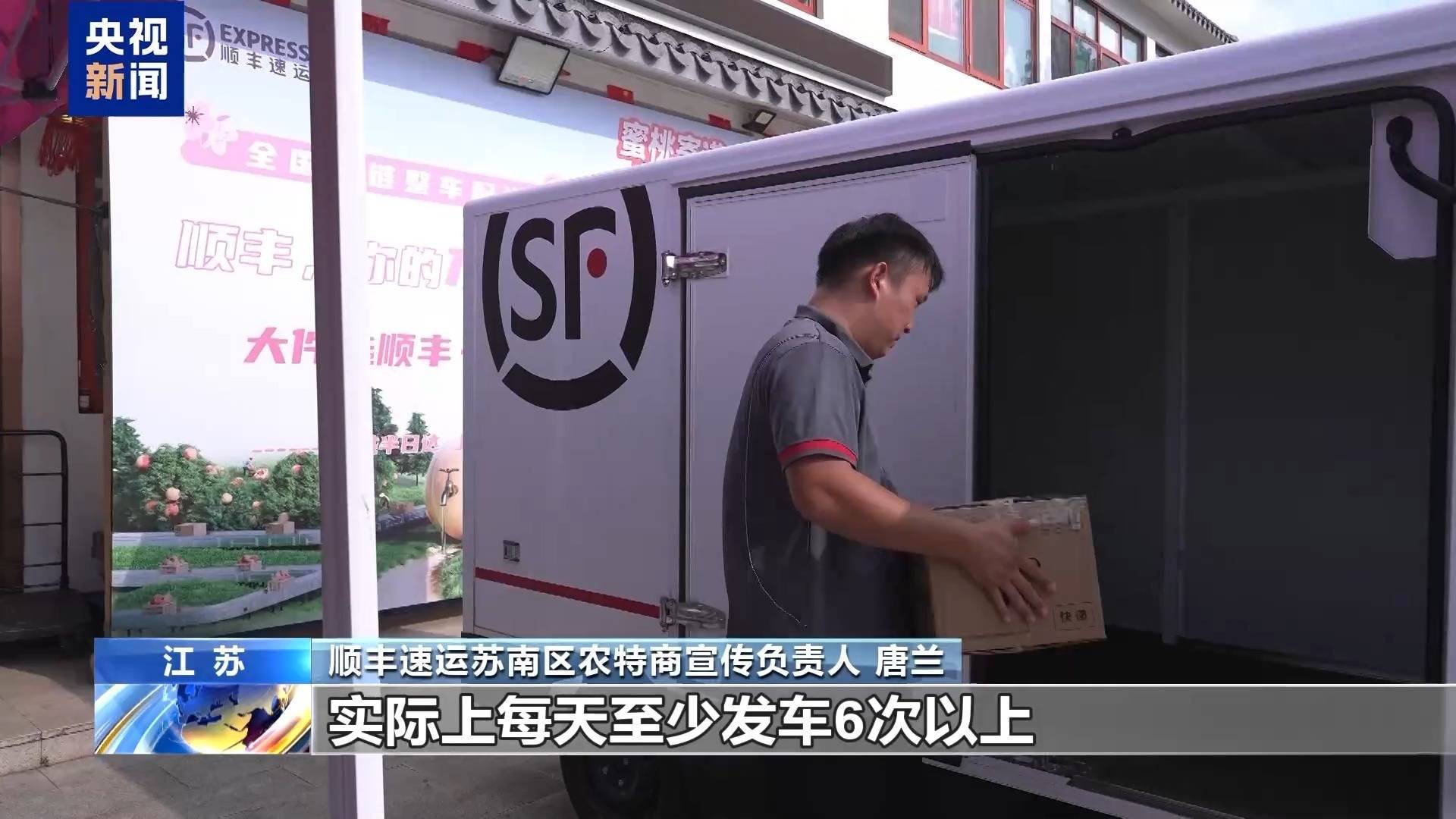 顺丰速运苏南区农特商宣传负责人 唐兰:以前我们无人车班次一天是4个,现在我们无人车装满即走,不限次数,实际上每天至少发车6次,水蜜桃发运时间减短了1到2个小时。