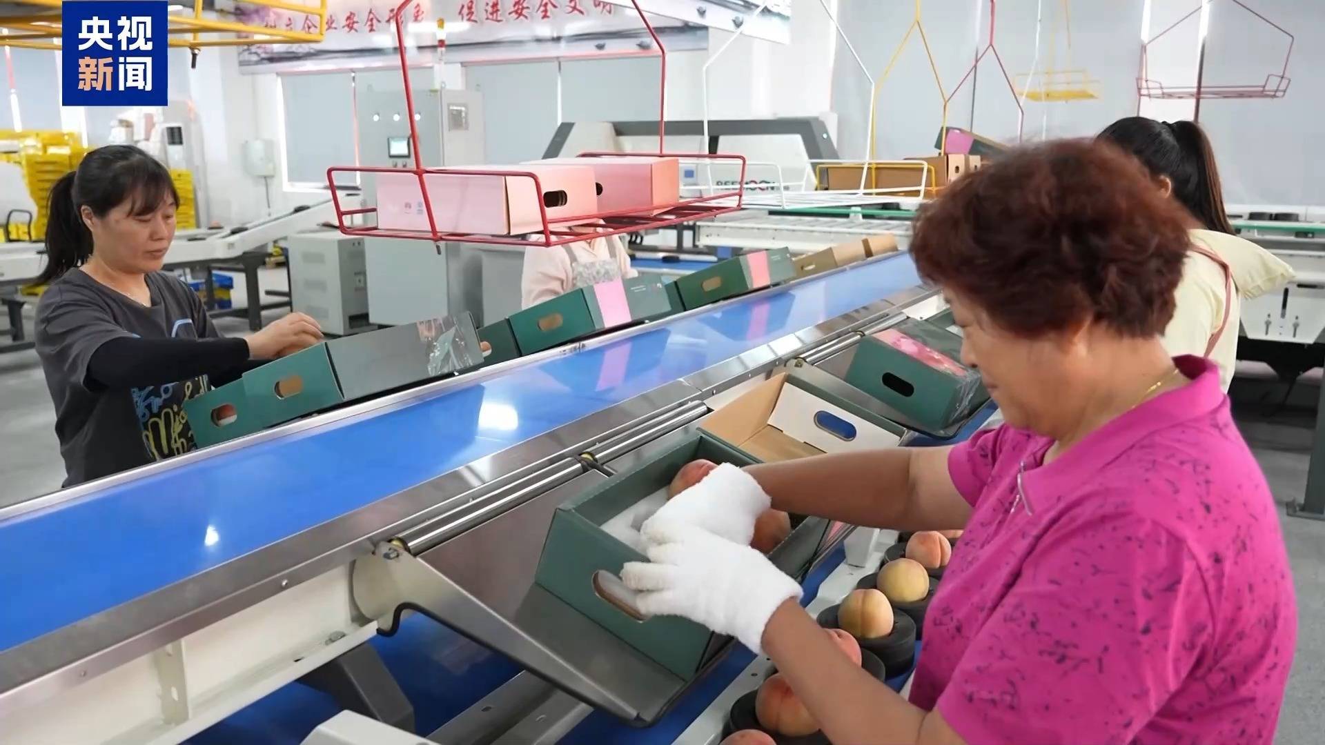 智能化水蜜桃分拣线上,桃子进入通道后,会被放到专门为硬度低、易损伤的水蜜桃设计的柔性果盘中,随后机器以每秒3个的速度,检测每个水蜜桃的外观、重量、糖度等数据。按照不同标准将水蜜桃分为9类进行分装。这台智能化设备每小时可以检测1万个左右水蜜桃。